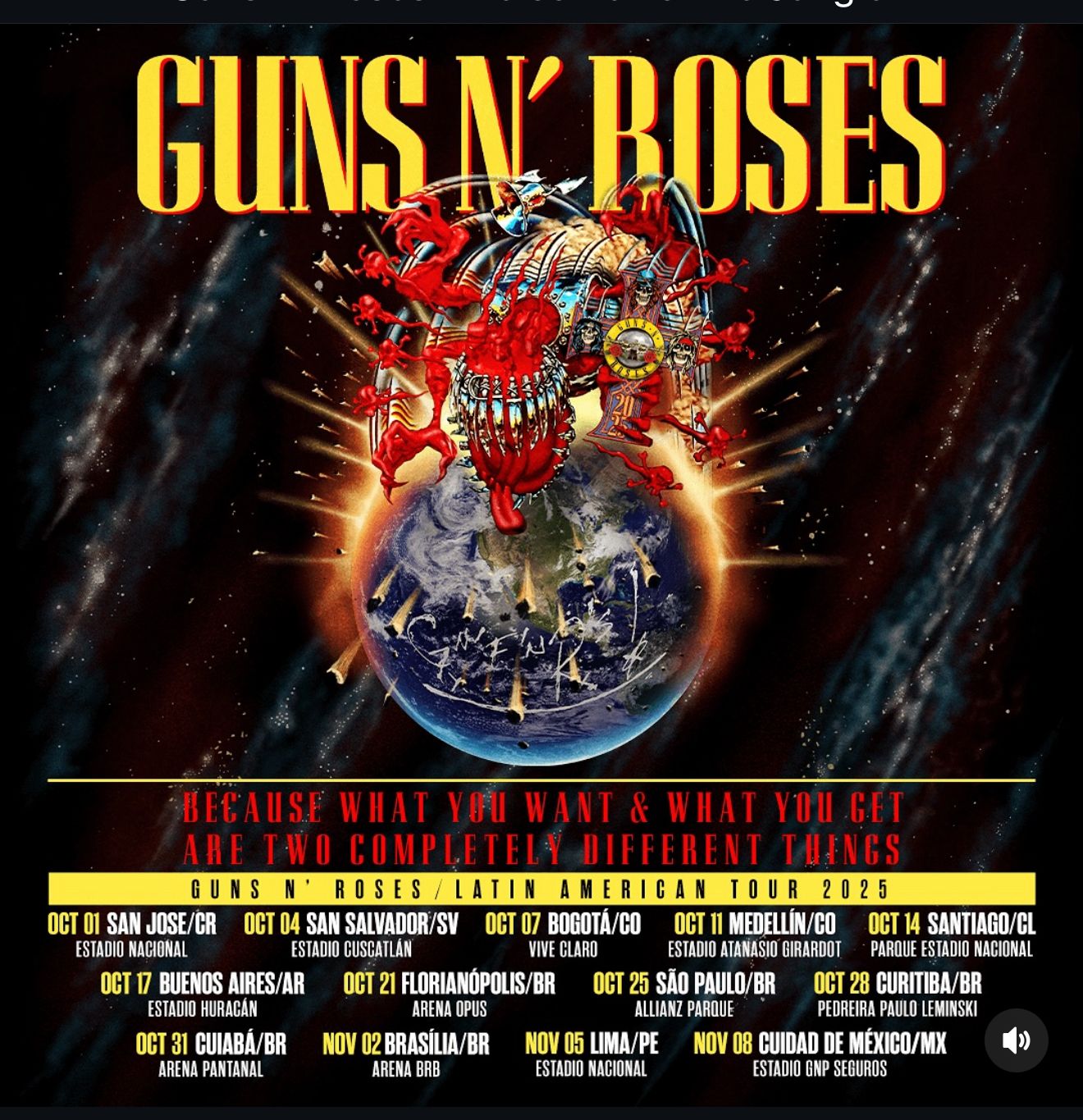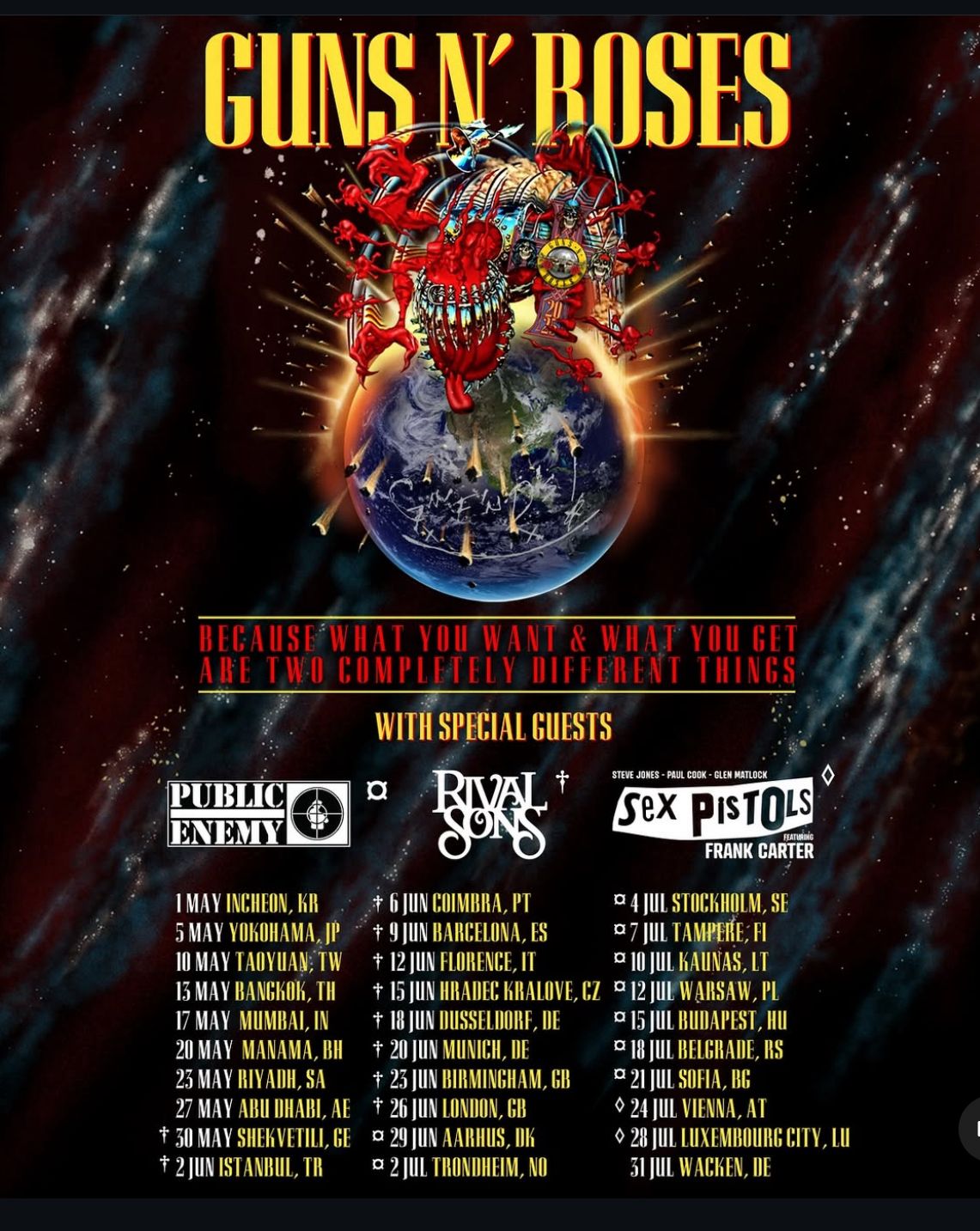 Eles estão de volta! Três anos após se apresentarem no Brasil, o Guns N’ Roses anunciou nesta sexta-feira (6), que está de volta ao país com a turnê “Because What You Want and What You Get Are Two Completely Different Things” (“Porque o que você quer e o que você terá são duas coisas completamente diferentes”), iniciada na Ásia, com datas marcadas também no Oriente Médio e na Europa. O show só vai chegar ao Brasil no final do ano, especificamente nos meses de outubro e novembro.